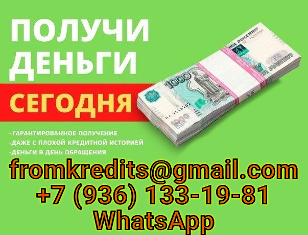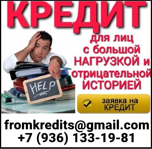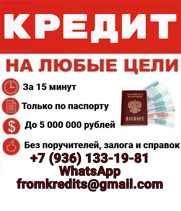 Кредит на любые цели и нужды для всех категорий граждан! Все города и регионы. Работаем напрямую, без посредников и рассылок. Предоплата и комиссия за оформление не предусмотрены. Подтверждение дохода и занятости не обязательно, кредитная история любая. Сотрудничаем только с гражданами старше 18 лет, с регистрацией на территории РФ. Предоставляем гарантии, которые другие предоставить не могут! Обращайтесь, если уверены в своей платёжеспособности в любое время! Заявки принимаем по электронной почте fromkredits@gmail.com и контактному телефону +79361331981 (WhatsApp).