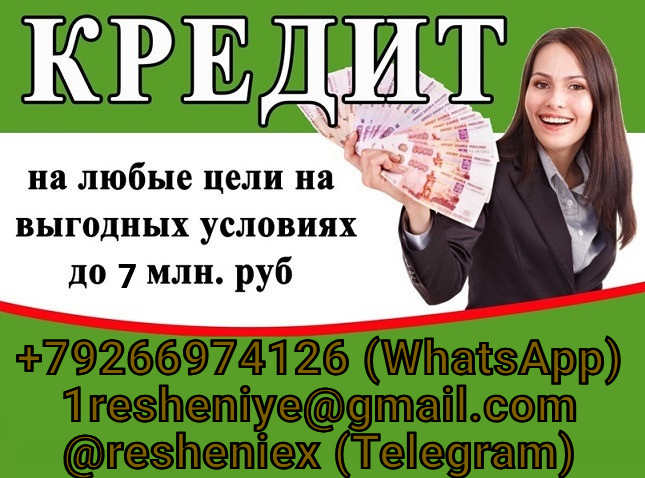 Доступные кредиты наличными на любые цели с гарантированным одобрением в день обращения! Минимальный пакет документов, выгодные условия и низкая процентная ставка. Строго без предоплаты, залогов, поручителей и скрытых комиссий! Помогаем заёмщикам: с любой кредитной историей, открытыми просрочками, большой долговой нагрузкой, работающим не официально без подтверждения дохода. Сотрудничаем со всеми регионами РФ. Профессиональное качественное обслуживание и индивидуальный подход к каждому клиенту! Сопровождение на всех этапах. Обращайтесь к нам и получите кредит без переплат уже сегодня. Электронная почта:1resheniye@gmail.com; WhatsApp +7-926-697-41-26; Telegram @resheniex